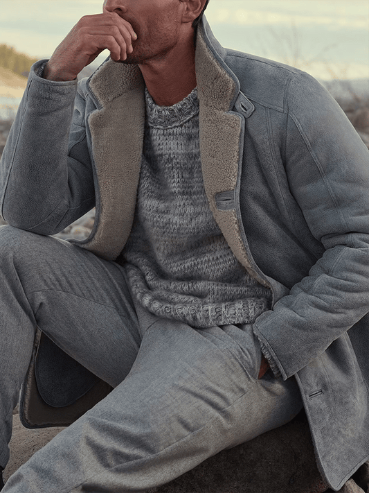 Men's Fashionable Open Pocket Button Design Imitation Leather Plush Warm Coat