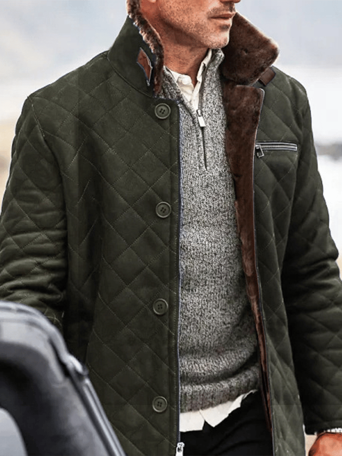 Men's Fashionable Open Pocket Button Design Quilting Imitation Leather Plush Warm Coat